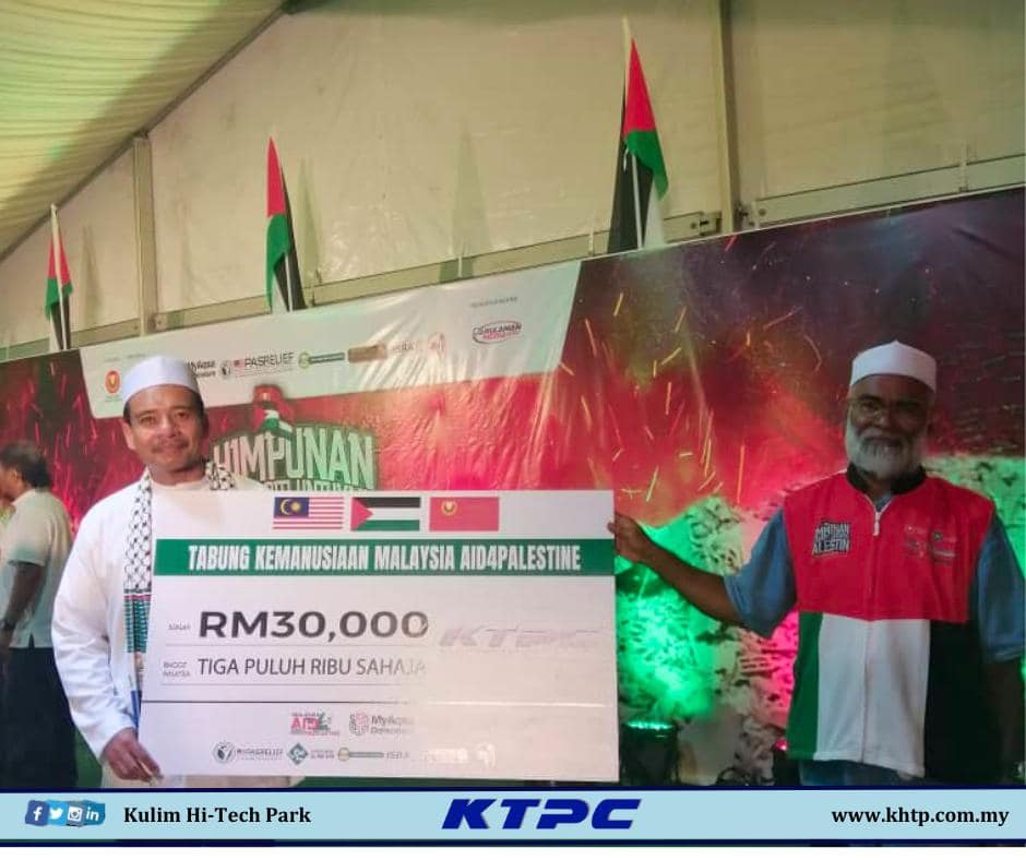 Kulim Technology Park Corporation Sdn Bhd (KTPC) turut memberi sumbangan sebanyak RM30,000.00 sahaja sebagai tanda sokongan dan ambil peduli dalam isu kemanusian terhadap Palestin. Encik Muhamad Hanif bin Omar Baki selaku wakil KTPC membuat penyerahan 𝑀𝑜𝑐𝑘 𝐶ℎ𝑒𝑞𝑢𝑒 kepada YAB. Menteri Besar Kedah semasa pelancaran sumbangan.